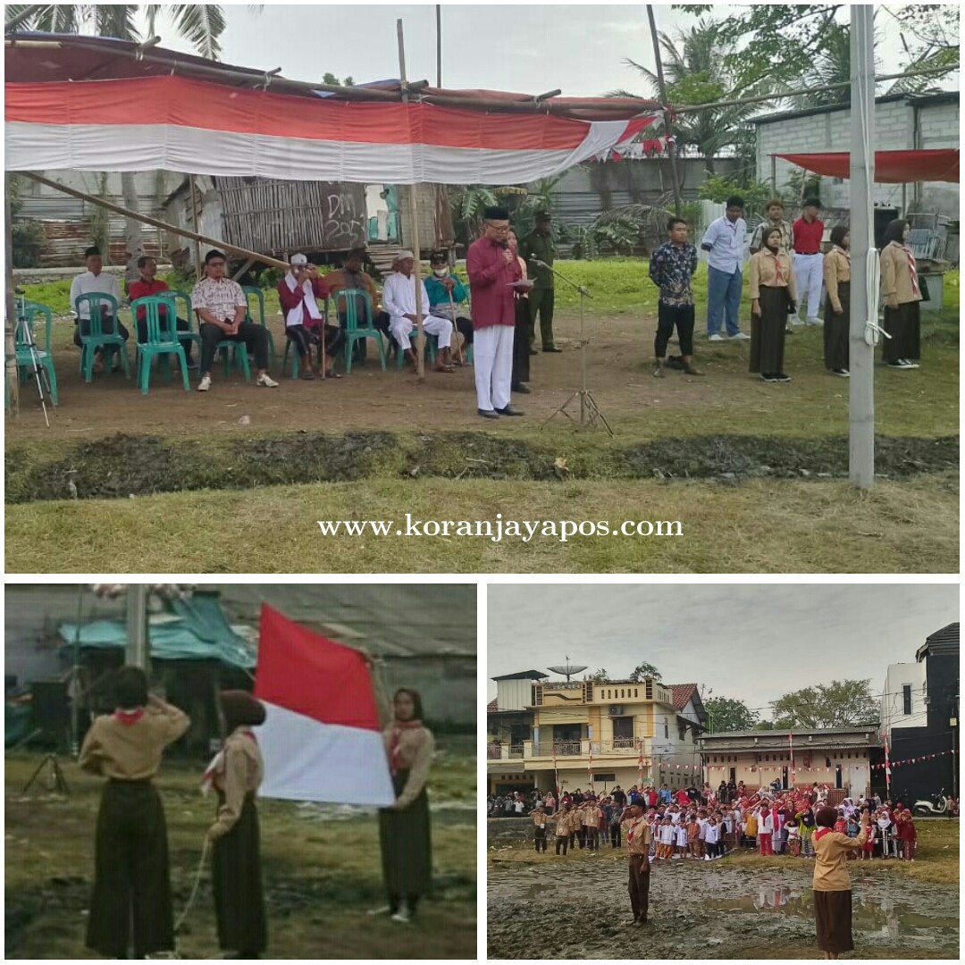 Warga Kp Pos 5 RT 01, RT 02, dan RT 03 RW 010 Semper Timur menggelar upacara pengibaran bendera Merah Putih, memperingati HUT Proklamasi RI ke-80, Senin (18/8/2025) di lapangan tanah kosong.Upacara bendera dimaksud